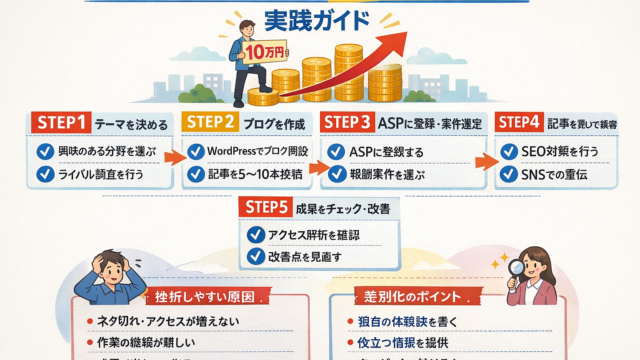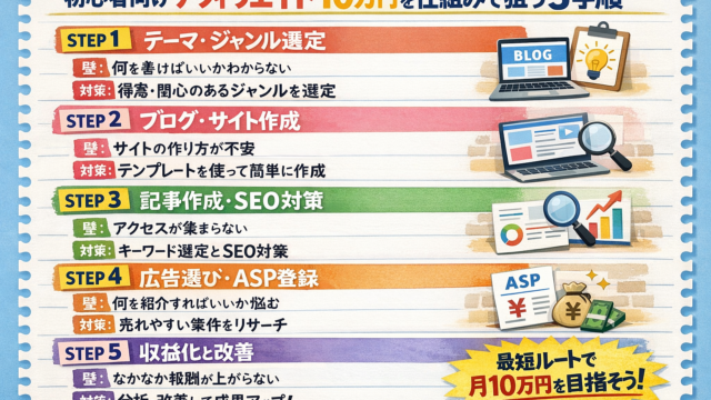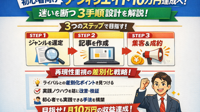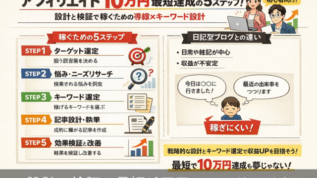 「アフィリエイトで10万円を稼ぎたい」と思って始めたものの、記事を書いても成果が出ず、何を直せばよいか分からない。あるいは、数千円〜数万円までは到達したけれど、10万円の壁が急に高く感じる。こうした悩みはとても一般的です。10万円は“才能の...