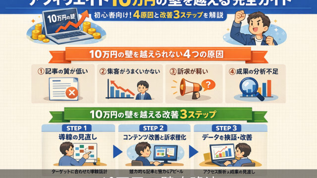 未分類 アフィリエイトで10万円の壁を越える4原因と改善3ステップを初心者向けにわかりやすく解説する完全ガイ